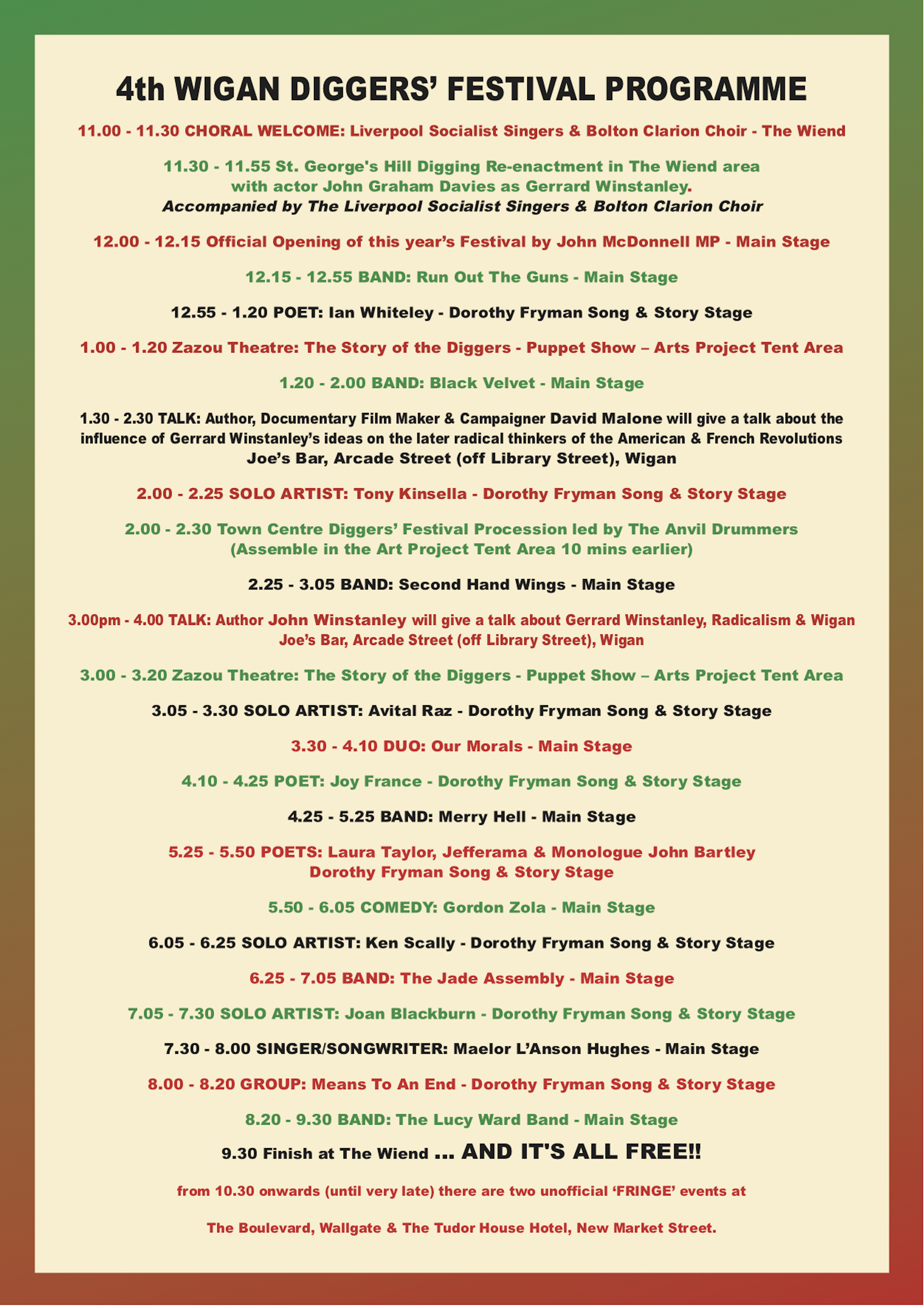 In brief: A feast of 24 excellent bands, duos, solo artists, poets and other performers (amongst them two radical choirs), a historical digging re-enactment, a puppet show, arts project tent, two educational talks, town centre procession, plus over 50 book, food and other stalls, not least of which, our ever popular “Occupie Wigan” Beer Tent serving our own specially commissioned and locally brewed (Allgates) Gerrard Winstanley Ale, (Prospect) Diggers 1649 Ale, (Holts) Resistance is Fertile Lager, and a range of other excellent beers, ciders and perry.