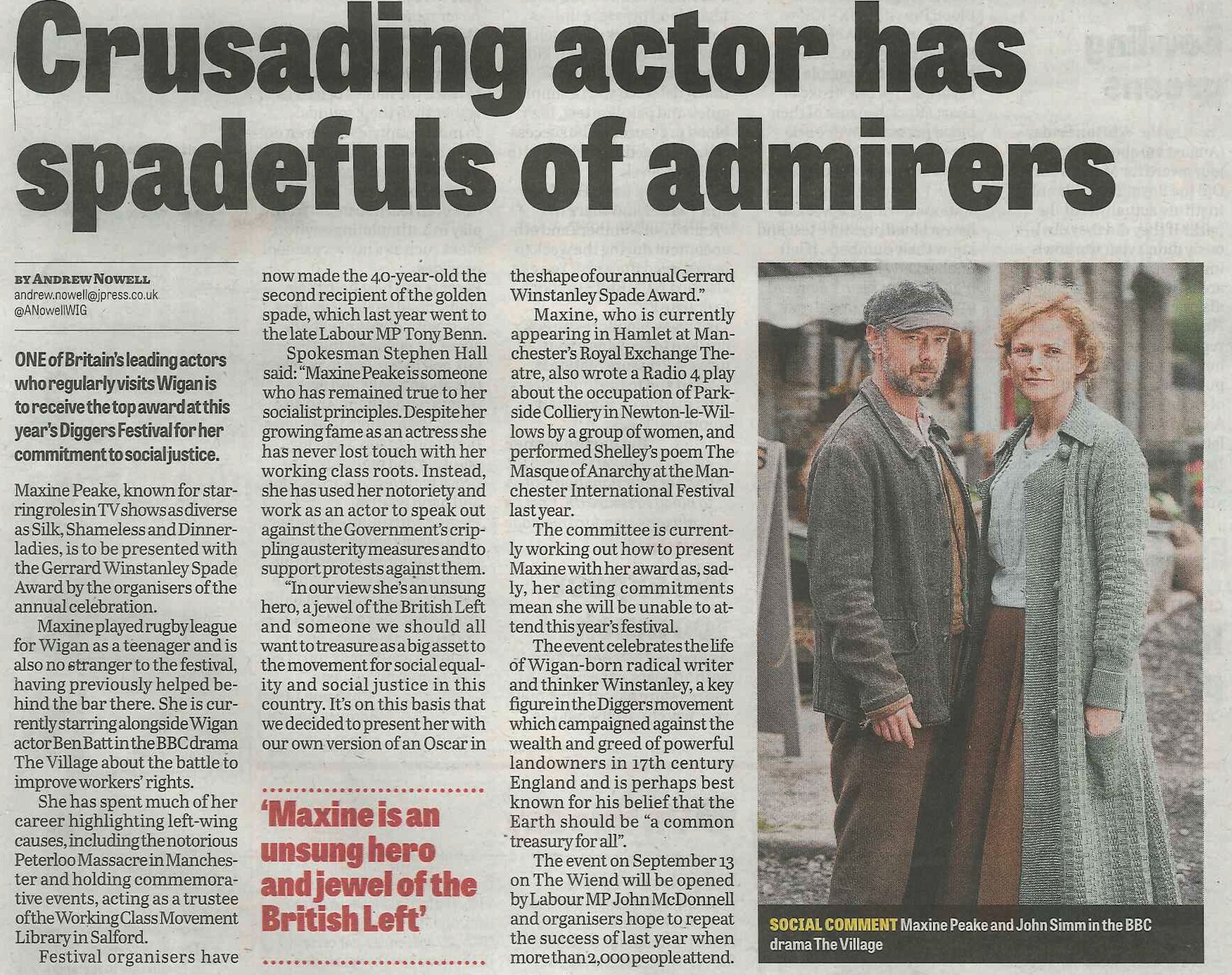 On Sunday local award winning actress Maxine Peake, who is currently playing the lead role in Shakespeare’s Hamlet, at the Royal Exchange Theatre in Manchester, was presented with this year‘s “Gerrard Winstanley Spade Award” presented annually by the Wigan Diggers’ Festival committee.