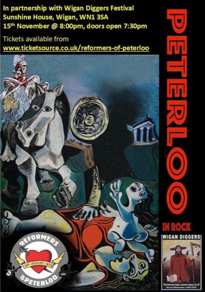 Tickets are now on sale for the ‘Peterloo in Rock Musical‘ Date: Saturday15th November 2025 Time: 8pm until 11pm (Doors 7.30pm) Place: Sunshine House Community Hub Wigan WN1 3SA We hope to see you there, thanks.