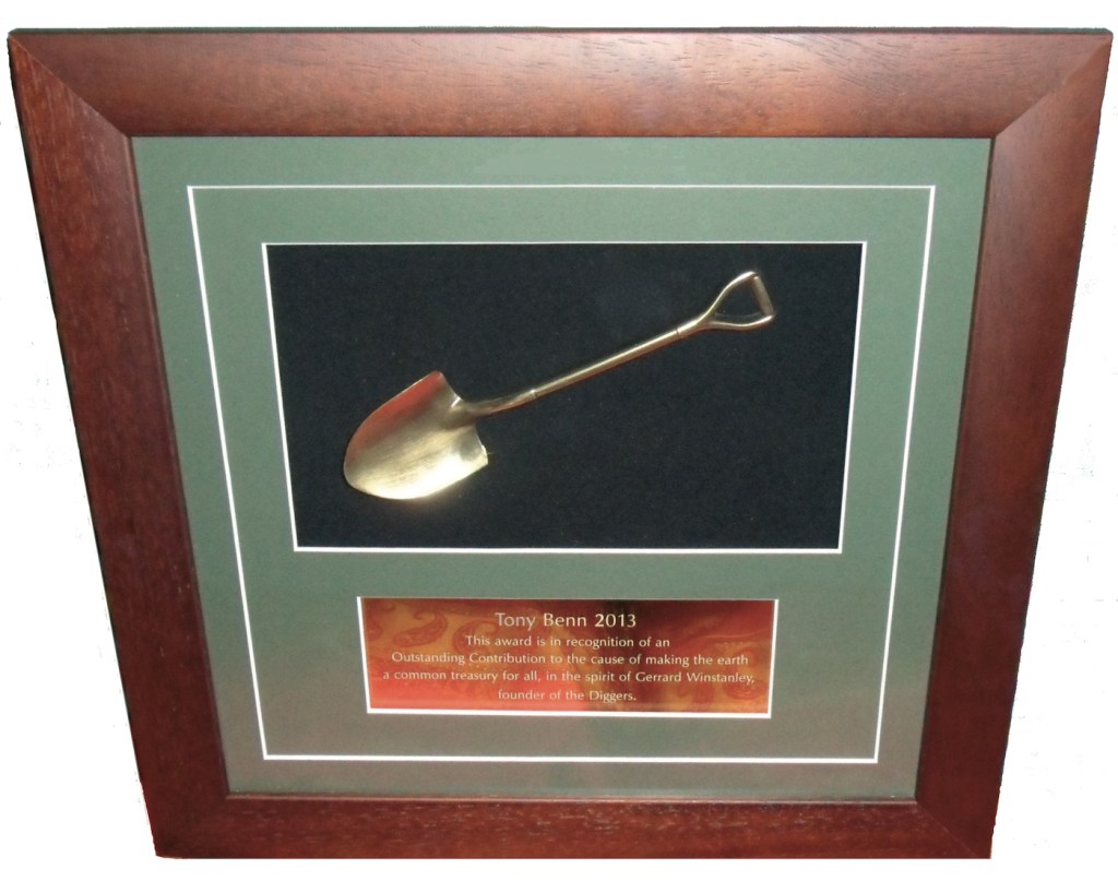 Our first Gerrard Winstanley Spade in 2013 was awarded to Tony Benn. In addition to everything else he did, he helped to populise Winstanley’s writings in his later life and described the 17th Century Diggers as England’s “first true socialists”. As Tony was too ill to travel to our festival to receive the award in person, and sadly died before we were able to formally present it to him, the Spade was later received by Tony’s son Hilary Benn (shown below) on behalf of Tony’s family.