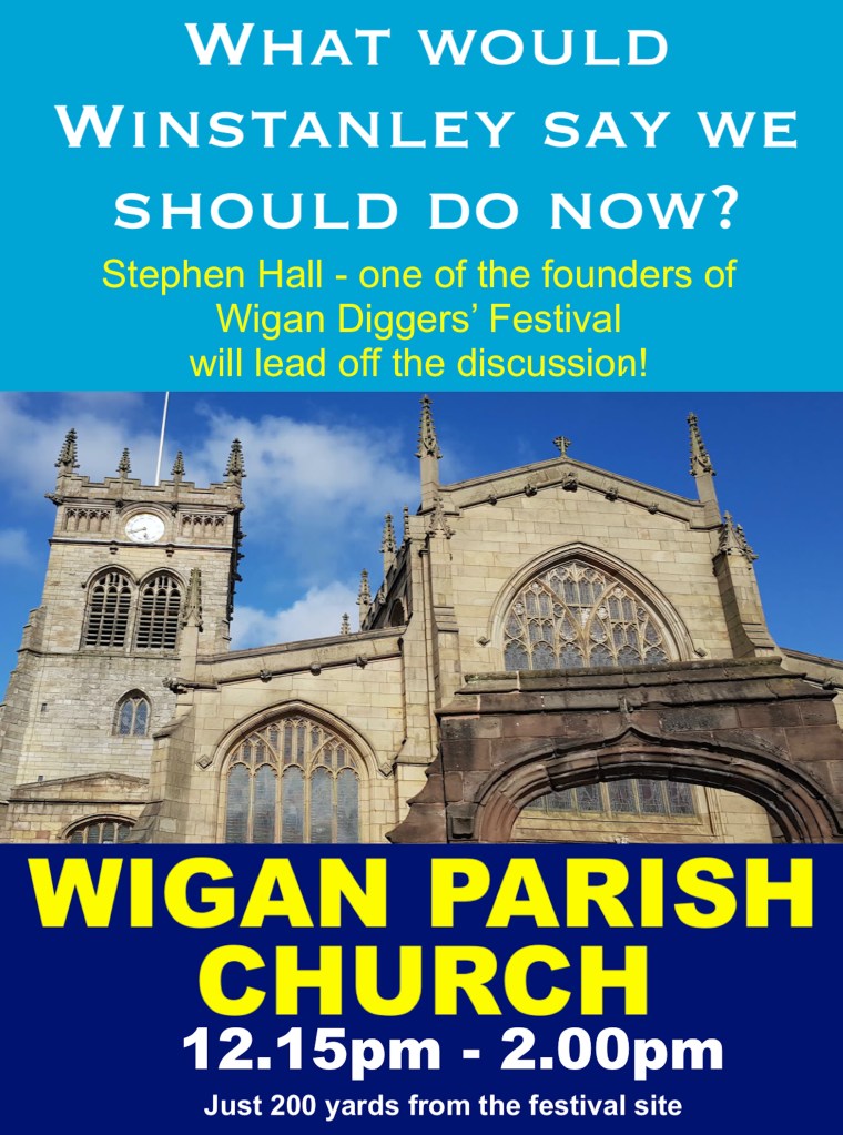 Here’s the final running order for Saturday’s 8th Wigan Diggers’ Festival which includes our best ever line-up of entertainment alternating between our main and acoustic stages; two fringe meetings; and an educational talk on Gerrard Winstanley in Wigan Parish Church. Also, for only our second year, the opportunity to hear some excellent speakers from a range of unions and campaign groups, etc, explain what they’re about and why they’re in Wigan on Saturday, via our ‘third’ town centre ‘Speakers’ Corner’ stage.