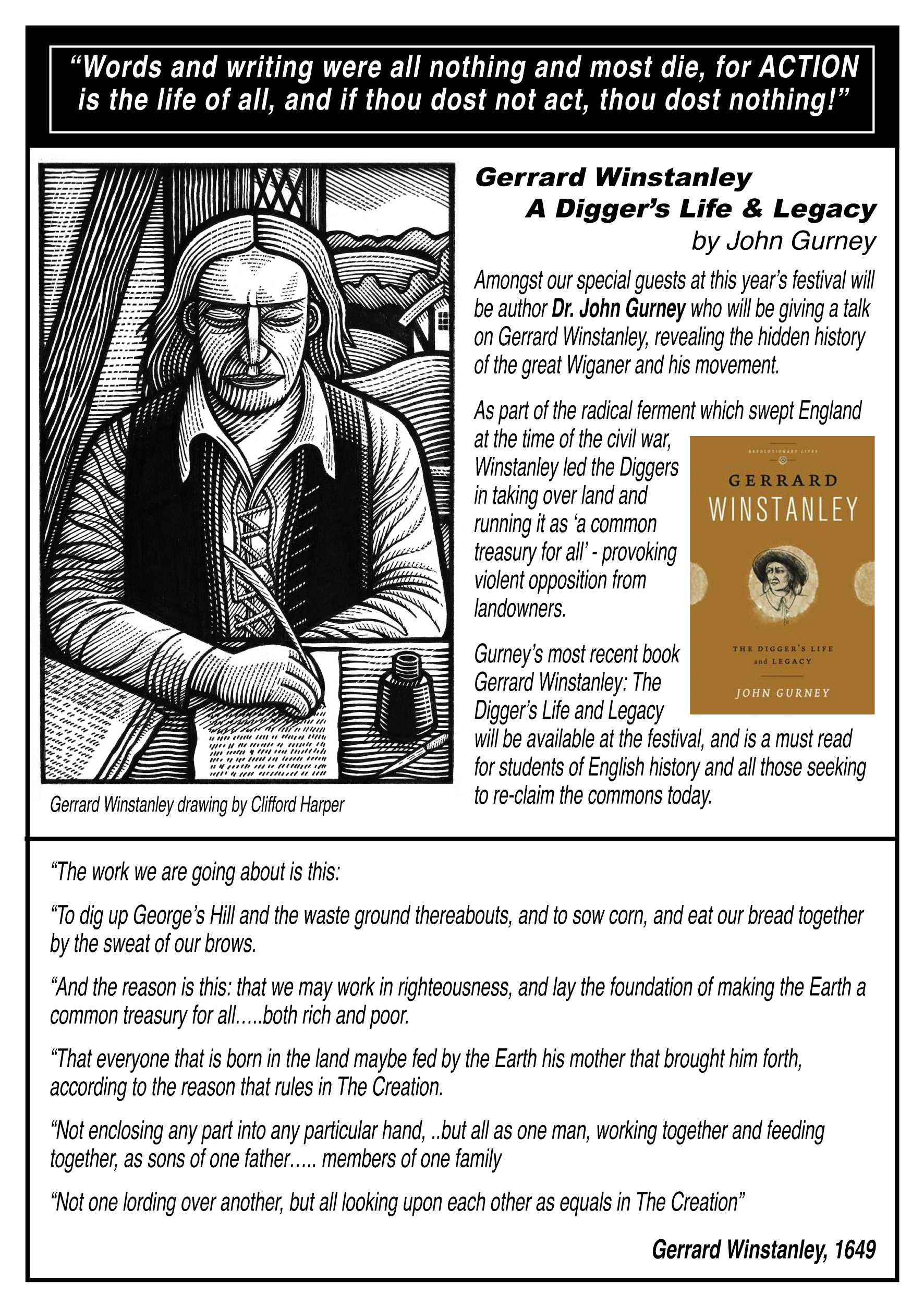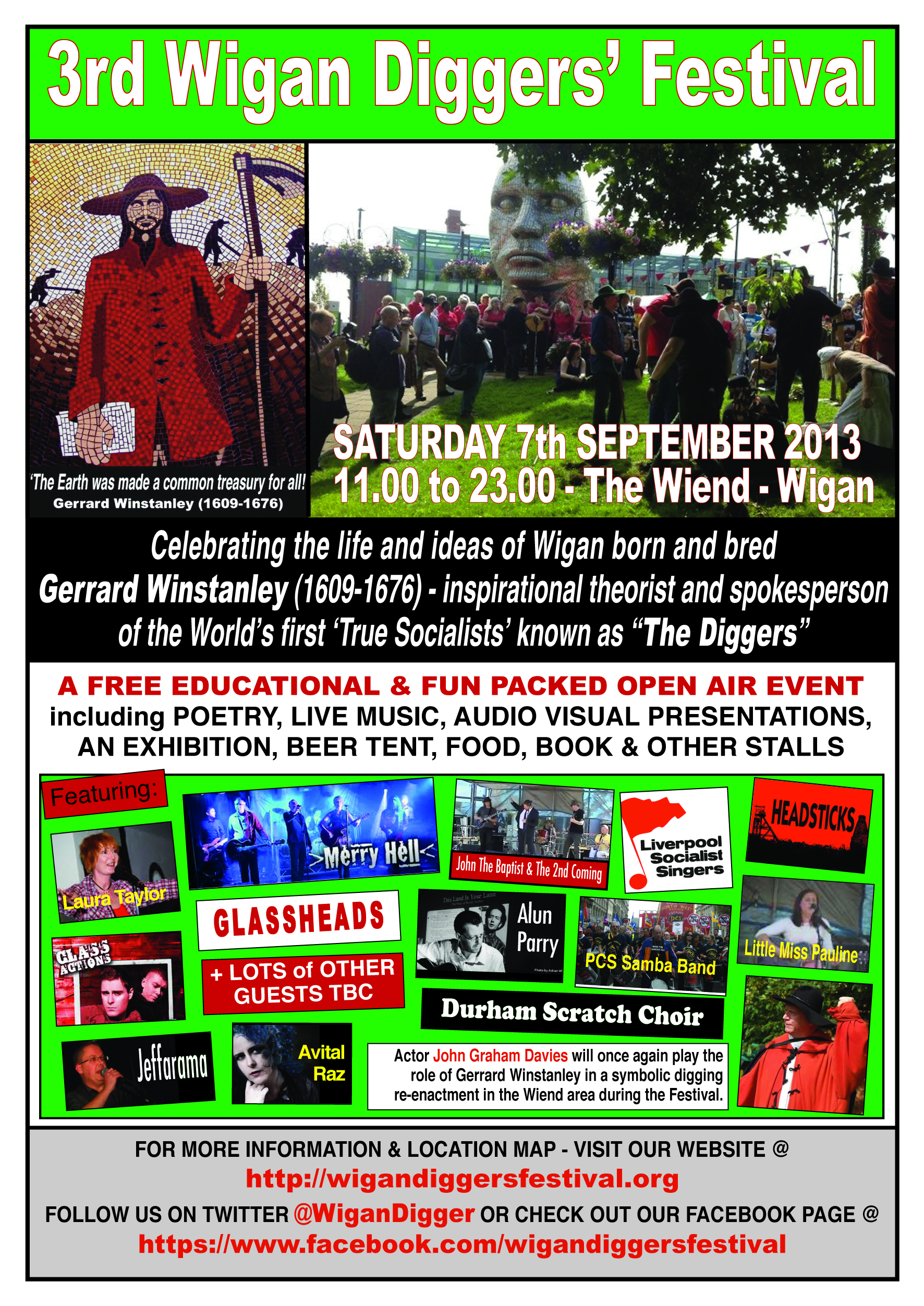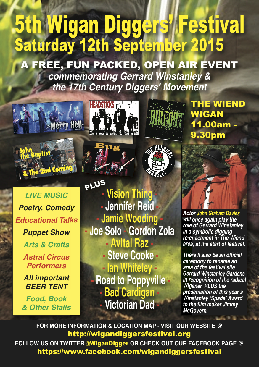 The Wigan Festival, which attracted a crowd of around 2,000 last year, celebrates the radical 17th Century “Diggers” movement, whose inspirational spokesperson and theorist Gerrard Winstanley was born and bred in the town, and whose vision of the Earth as “a common treasury for all”, organisers say: “…is still very much relevant to this day.”