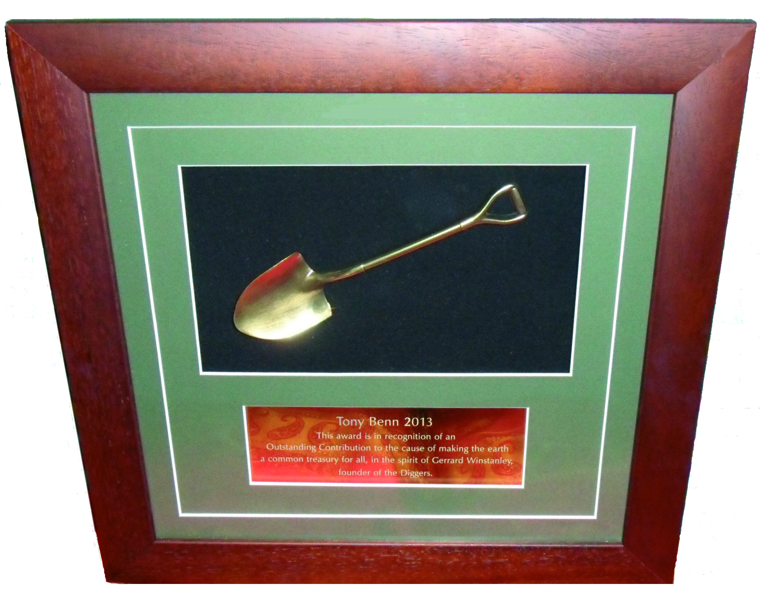After discussing a number of possibilities including a ‘Star of Winstanley’ medal, we finally agreed on the obvious, and something wholly in keeping with Gerrard Winstanley’s digging activities in Surrey and elsewhere, in the shape of small brass spade, mounted along with an engraved plaque in a framed display case (see above left).