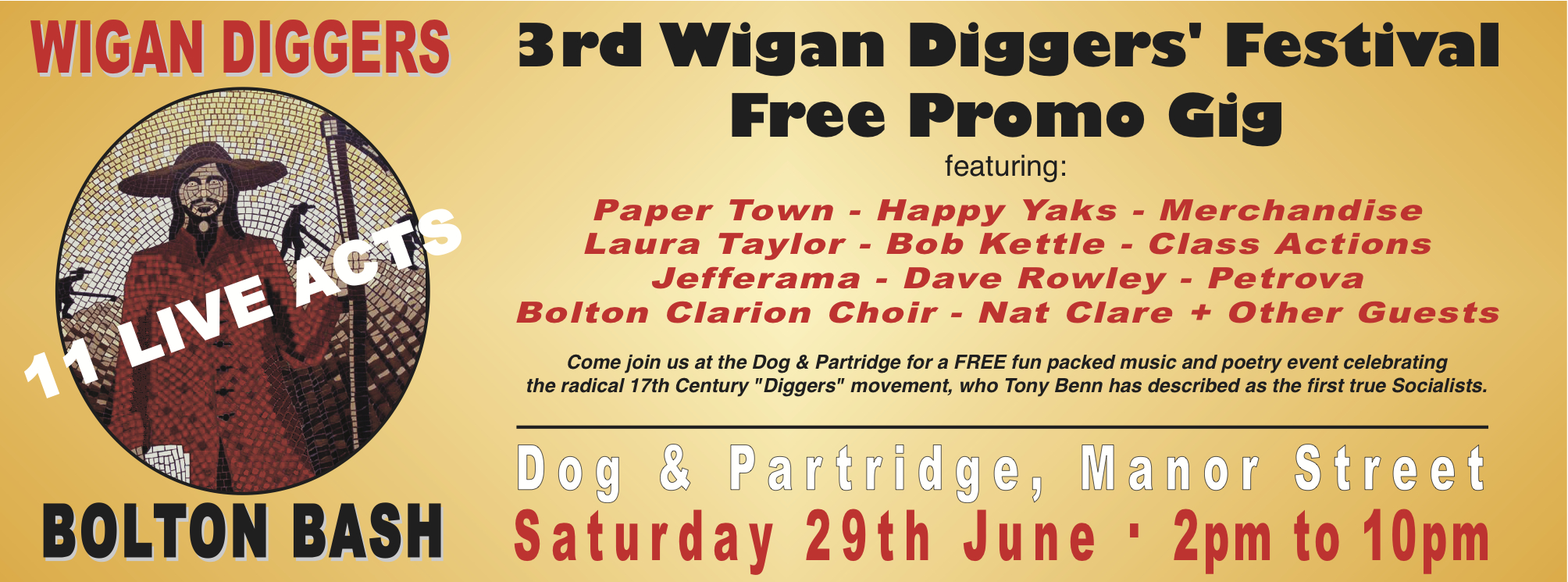 Come join us at the Dog & Partridge in Bolton on Saturday 29th June for a FREE all day fun packed music and poetry event to promote the forthcoming (3rd) Diggers’ Festival on 7th September 2013 in Wigan town centre.